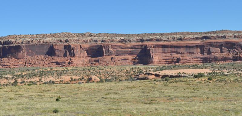 Sedimentary rock erodes in a vertical manner, so the multitude of distant cliffs are all laid out with their sheer drops. Occasionally the rock is punctuated by rare pockets of vegetation eking out a precarious life on narrow level ledges. Occasionally a raven or hawk may be flying by.